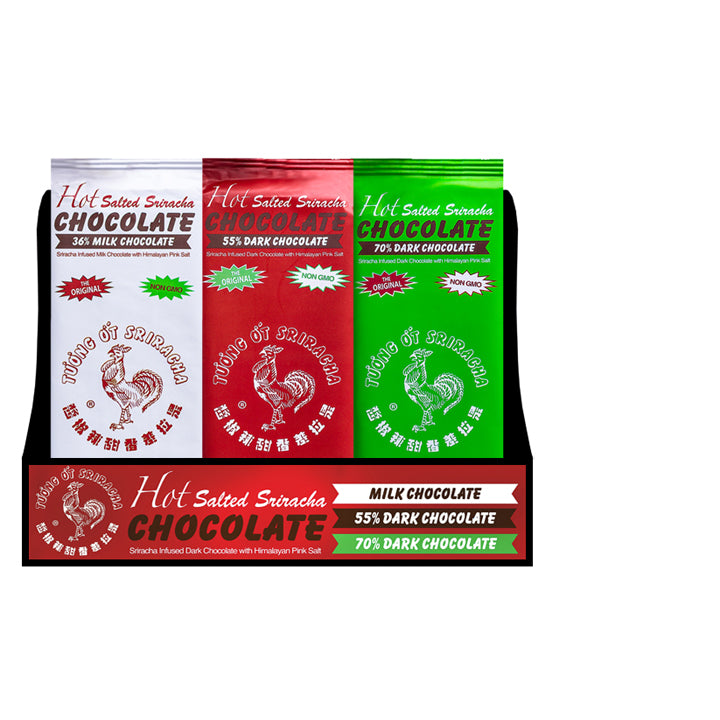 • 18 bars total, 6 each in all three Sriracha Chocolate flavors- Milk Chocolate, 55% Dark Chocolate, and 70% Dark Chocolate.