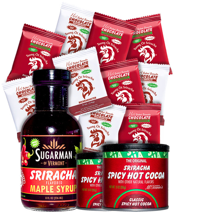 Sriracha tastes in some of our favorite items. Sweet heat in the new Sriracha Maple Syrup, Artisan Chocolate Bars, and Sriracha Hot Cocoa Mix.