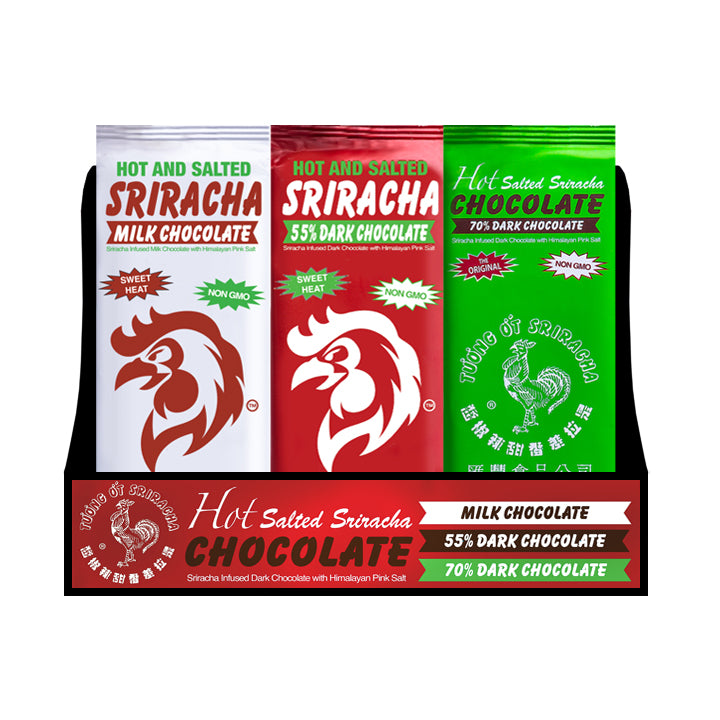 • 18 bars total, 6 each in all three Sriracha Chocolate flavors- Milk Chocolate, 55% Dark Chocolate, and 70% Dark Chocolate.