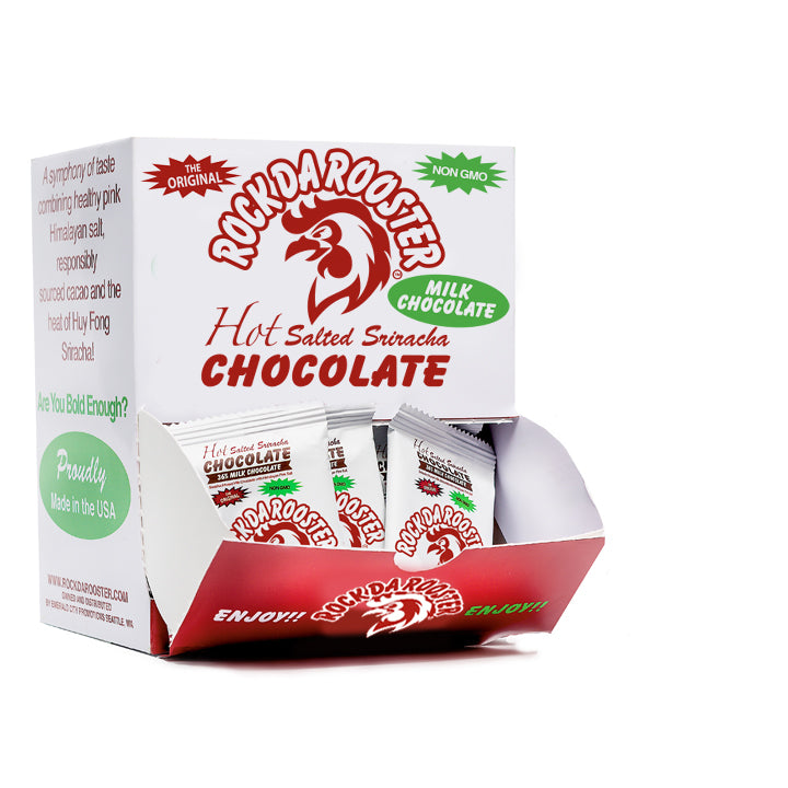 Bite sized bars in our indulgent Sriracha Seasoned Milk Chocolate. It's the perfect grab n go, need my taste of sweet heat. Shipped in a bold “ROOSTER” Gravity Box. The Perfect Gift for the Sriracha Fan!