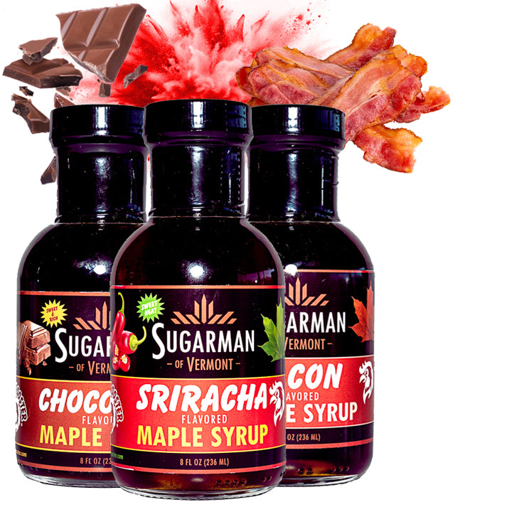 Sweet Heat Sriracha Syrup, Creamy Indulgent Chocolate Syrup, and Smokey Bacon Syrup.